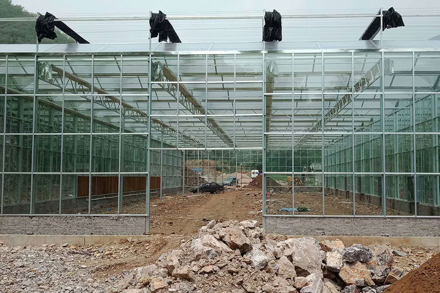 The main structure is made of hot-dip galvanized pipe. The covering material is made of sun plate, ordinary or hollow glass. It is inlaid with aluminum alloy profile for greenhouse. The joint between the edge and the aluminum alloy profile is sealed with ethylene-propylene rubber strip.
